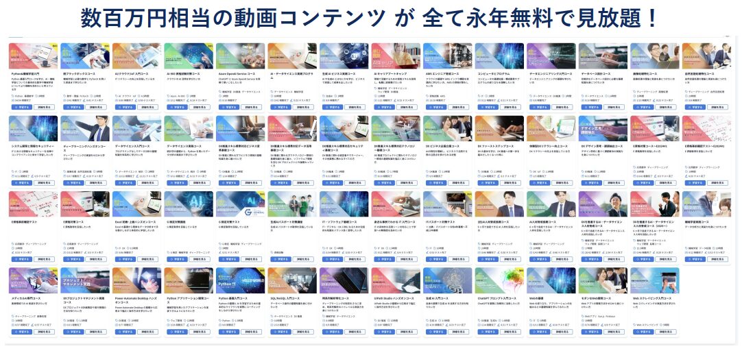 長期コースを受講すると、他のすべてのコース(画像特化、自然言語特化、モダンなWeb開発コース等々)も無料で視聴可能に!(しかも視聴期限は一切なし。卒業後もいつでも復習できます。)