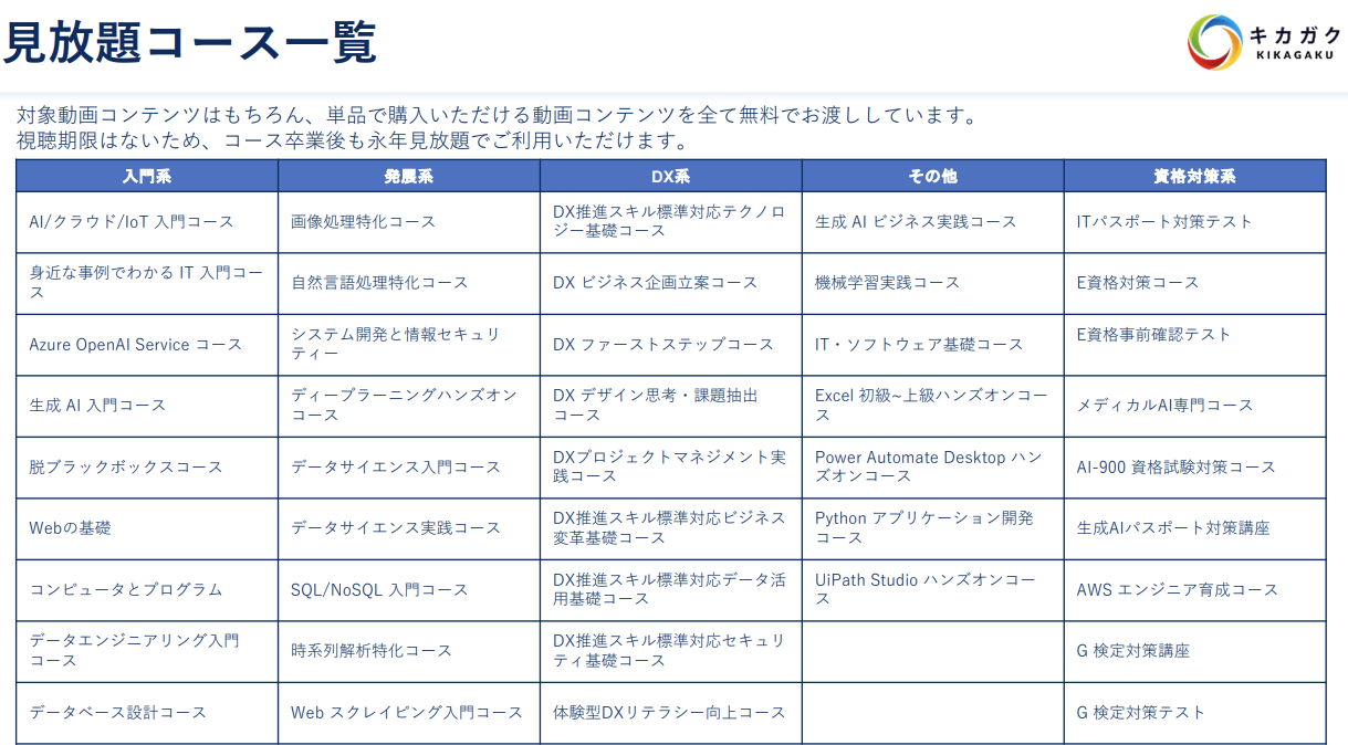 そんなあなたにぴったりなのが、AI・ITスキルの総合学習プラットフォーム『キカガク』が提供する生成AIビジネス実践コースと、AI・データサイエンス人材育成コースです。