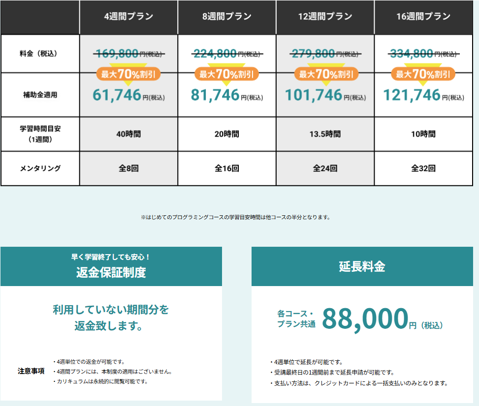 転職支援とかいらないよーって人はこちらの方が安いです。同じDMMです。給付金も使えるし、8週間プラン以降は早期に終わった場合は返金保証もついています。サクッと終わらせたい人向きですね。