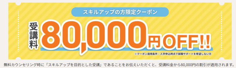 カウンセリング時、スキルアップのための受講と伝えるとスキルアップ目的割引が適用されます。