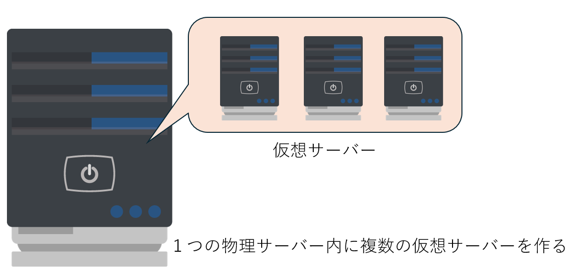 「仮想化」とは、1台の物理的なサーバーをソフトウェアの力で分割し、複数の仮想サーバーとして使えるようにする技術のことです。