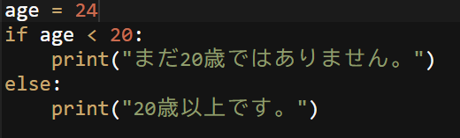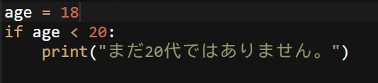 print("お酒は飲めません。")  # ← 同じインデントなので、ここまでが if のブロック