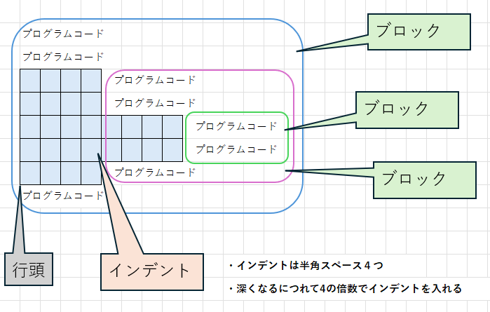 (実際はインデントが入ってさえいれば何個でもプログラムは動きます。統一されてないといけませんが。)