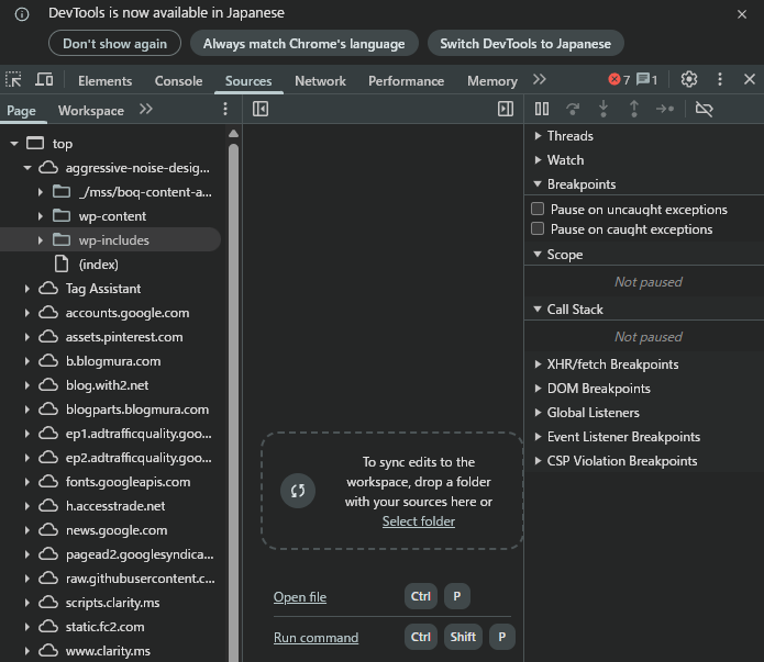 サイト内のJavaScriptやCSSファイルを一覧で確認でき、ブレークポイントを設定して処理の流れを追うことができます。