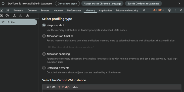 アプリやWebページのメモリ使用状況をグラフで表示します。