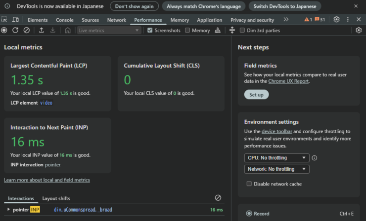 • Largest Contentful Paint(LCP)Cumulative Layout Shift(CLS) の数値を確認