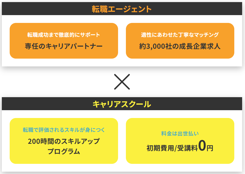 | 「他のスクールやエージェントと何が違う?」 | 単なるスキル習得・求人紹介ではなく、キャリア設計から転職後まで一気通貫で伴走してくれることが強み。 |