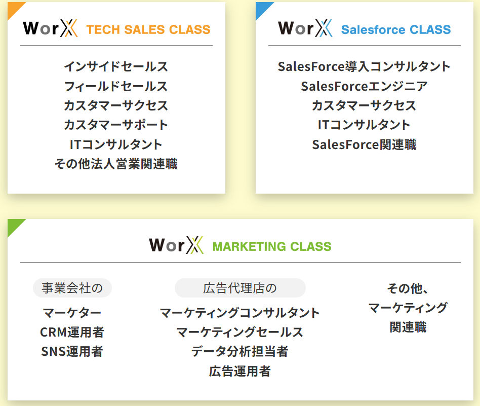 WorXは、Webマーケティング・セールス・エンジニアなど20職種以上に対応する200時間の実践学習プログラムを提供。